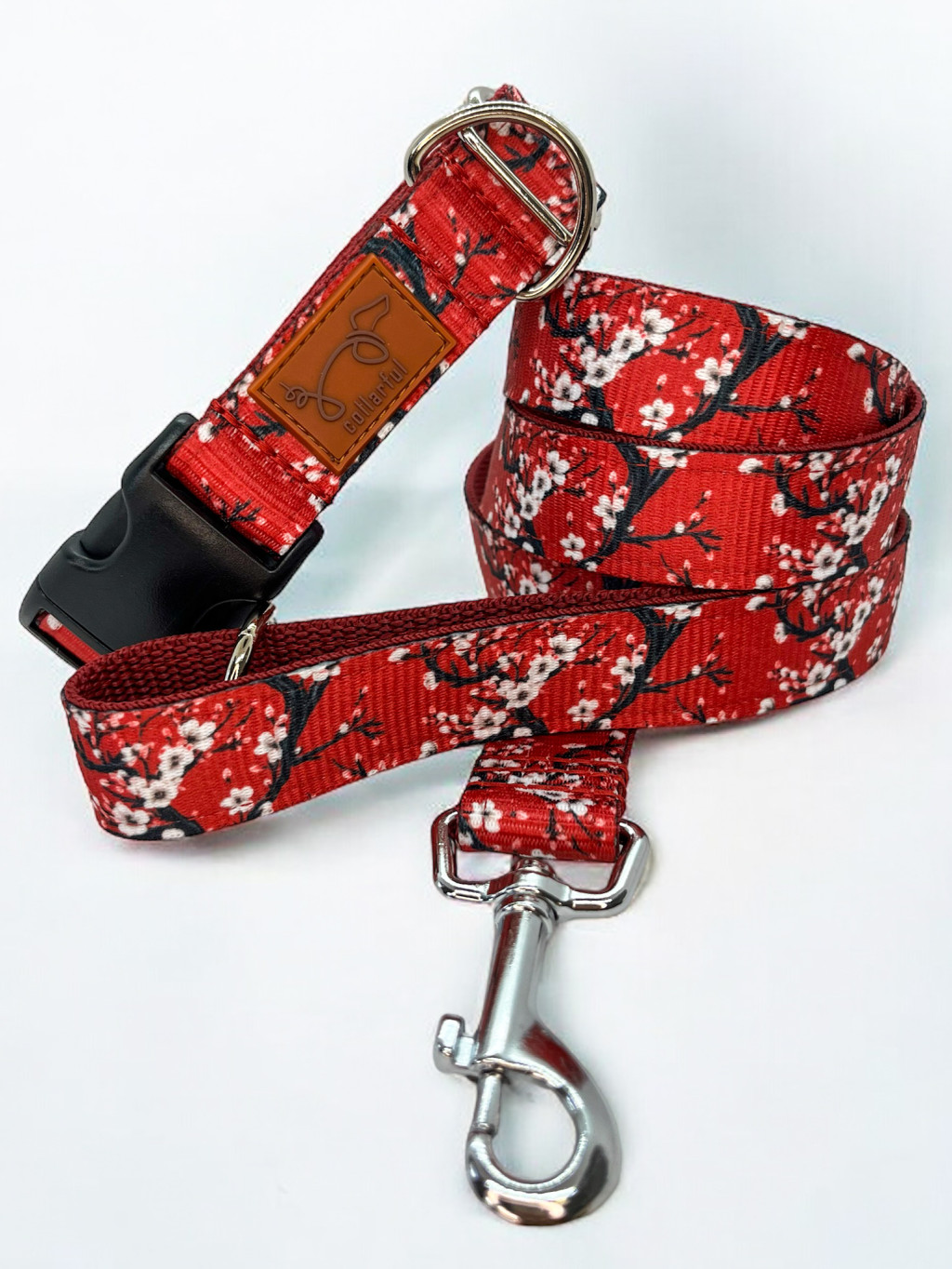 Cseresznyevirágos nyakörv és póráz szettünk vidámságot hoz a mindennapokba! Kérjük vedd figyelembe, hogy a képen szereplő termék rose gold fémkiegészítőkkel készült, ezt felár ellenében tudod kiválasztani rendeléskor.