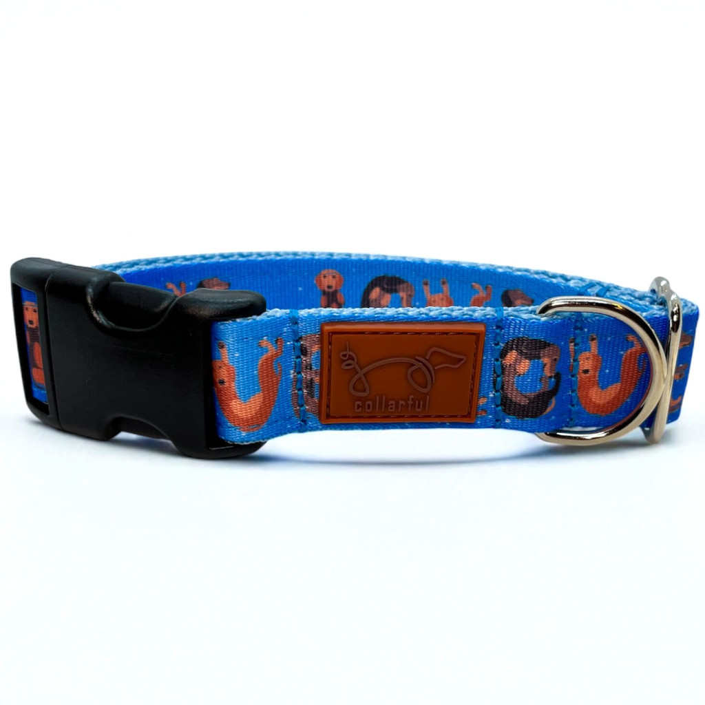 Kérjük, vedd figyelembe, hogy ezen a terméken a minta háttere színátmenetes (sötétkék-világoskék-sötétkék), így nem tudjuk garantálni, melyik szín fog dominálni a terméken. Ez főként a nyakörvre igaz, a pórázon a hosszúsága miatt mindkét szín jelen van.