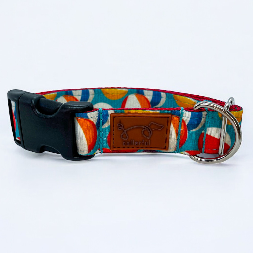 Strandlasztis nyakörv és póráz szettünk igazán vidám minta, nem csak a nyári napokat dobja fel! Labdamániás kutyusoknak kötelező darab! :)